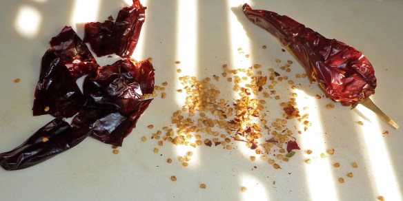 Dried chills are first seeded and stemmed and then toasted. Once toasted: