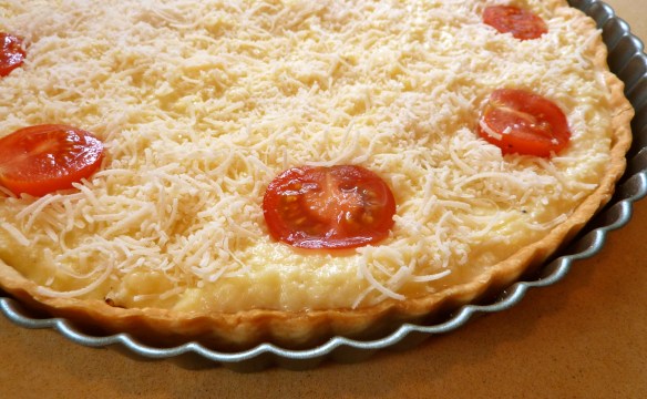 6. Spread egg mix over onions in crust. Sprinkle Gruyère (you may also substitute additional parmesan here) on top. Place tomatoes, cut in half, cut side up around edges. If tomatoes are larger than cherries or small campari tomatoes, slice rather than cut in half as tomatoes should be on the top of the tart and not all the way through.
