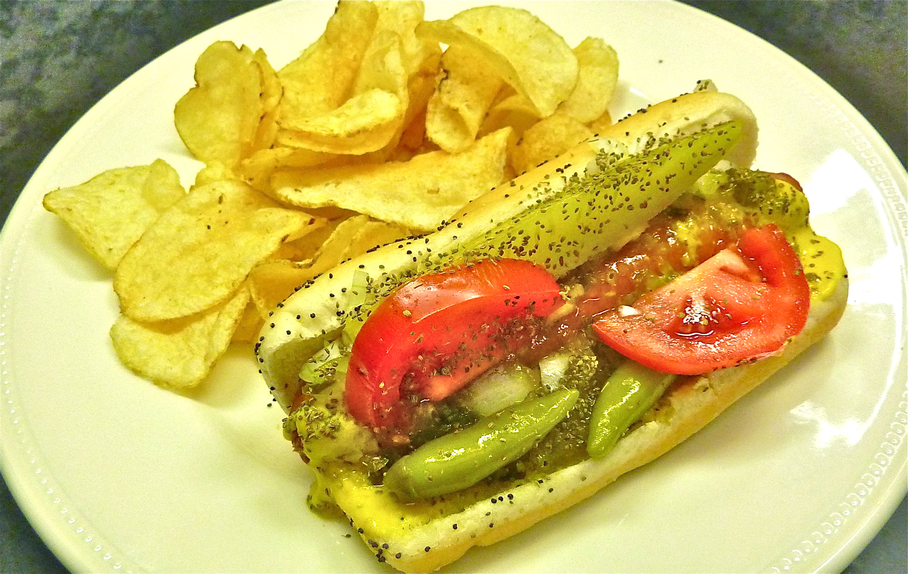 Before I provide the recipe, I must tell you that both ingredients and quantity are important here.  For example, you can’t use just any kind of pepper; you must use spicy, green “sport” peppers — and one will not do as you must use two.   This is the same for other components.   The pickle spear must be a dill pickle — and one spear only.  I think you get the picture.   A true Chicago Hotdog does not allow for culinary creativity.