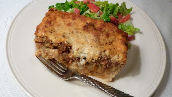 This is about another of my favorites, pastitsio, which is among the many delicious Greek dishes that Sandy and Ya Ya introduced me to.   Pastitsio is to the Greeks what lasagna is to the Italians — tomato, meat and cheese-based comfort food.  They are both delicious dishes.  But I particularly love the way pastitsio surprises you with unexpected flavors — allspice, nutmeg, lamb and salty keflatori cheese.  If you don’t like lamb, beef can be substituted, and half beef/half lamb works as well.  I, however, prefer the strong and sultry taste of lamb — strong enough to contrast with the sweet spices.