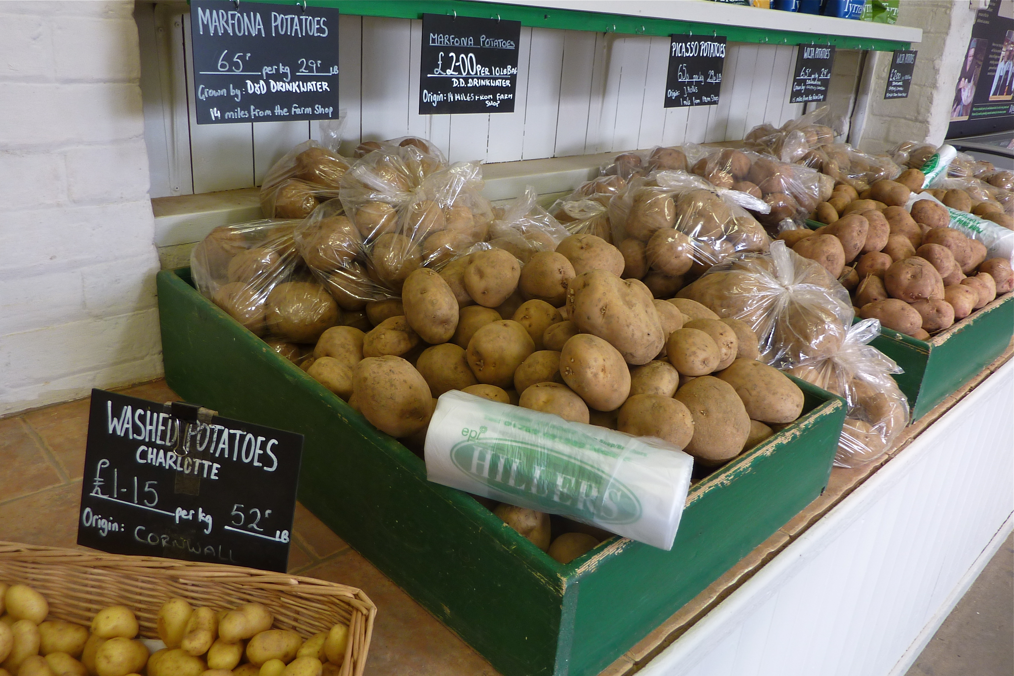 Now for the creme de la creme of the English farm shop — great produce. The mild UK climate is suited to many kinds of produce.  However, it seems to be most appreciated by the cruciferous family — broccoli, brussels sprouts, cabbage, watercress, etc. — which can be found in abundance here.  Asparagus, when in season, would give even the delicious Michigan asparagus some competition.   There are also so many kinds of potatoes — all with funny names and great taste.   Why is it that you can’t find any of these potatoes here in the U.S.?  The answer to that question will also need to be a post for another day.
