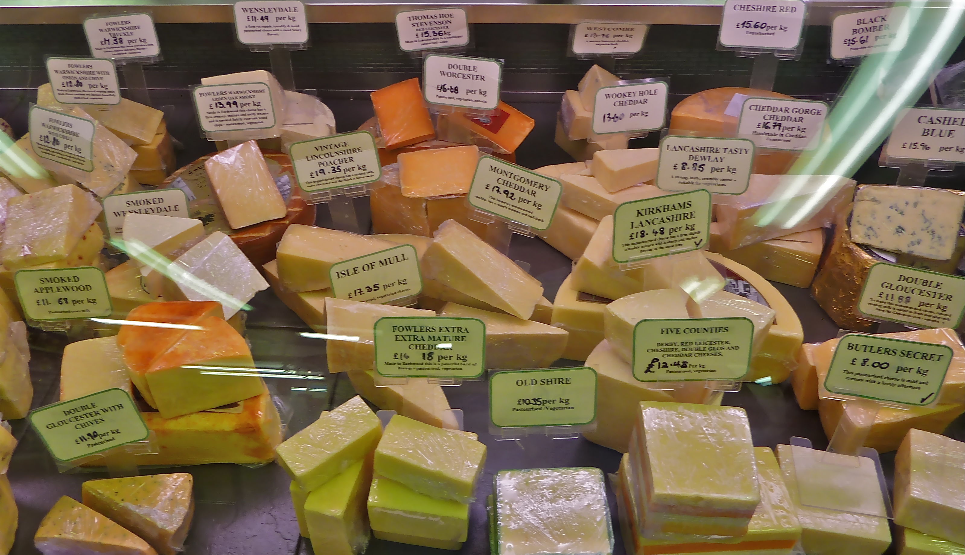 In addition to produce and farm-fresh meats, Hillers has an amazing cheese shop.  I could write a dozen posts on the UK cheeses at Hillers, but that will have to wait for another day.  Suffice it to say that English (and UK) cheeses include more than the renowned stiltons and cheddars.  It is difficult to pick my favorites. However, they certainly include Cornish Yarg, which has a tasty rind of nettle, those nasty stinging plants that nip your ankles in the summer.  Nettle is much better to eat than it is to your skin.  I also like Warwickshire Truckle, as delicious as the name is charming.