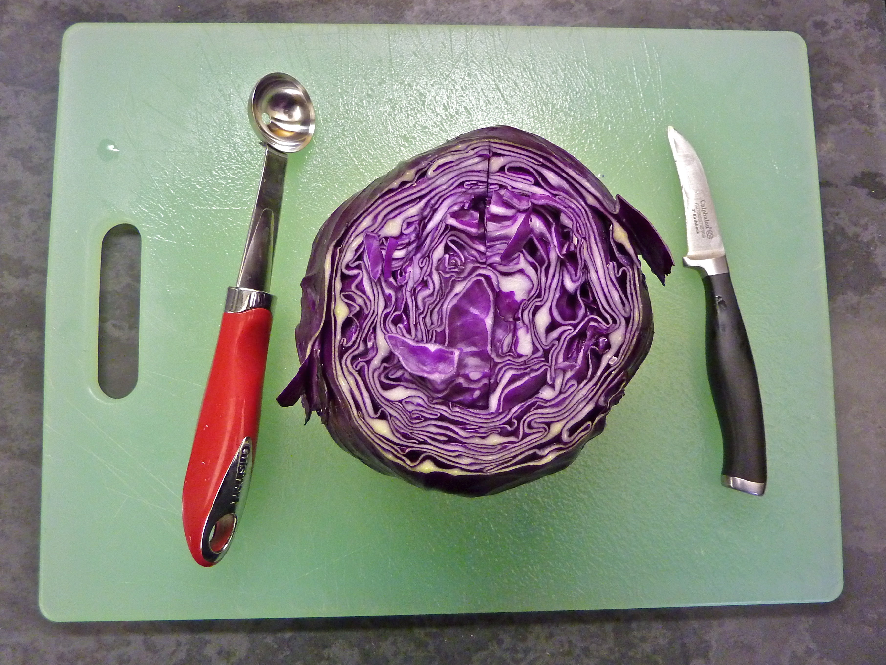 Tools for Making Your “Cabbage Bowl”. Cabbage Shown with Top and Bottom Trimmed.