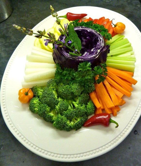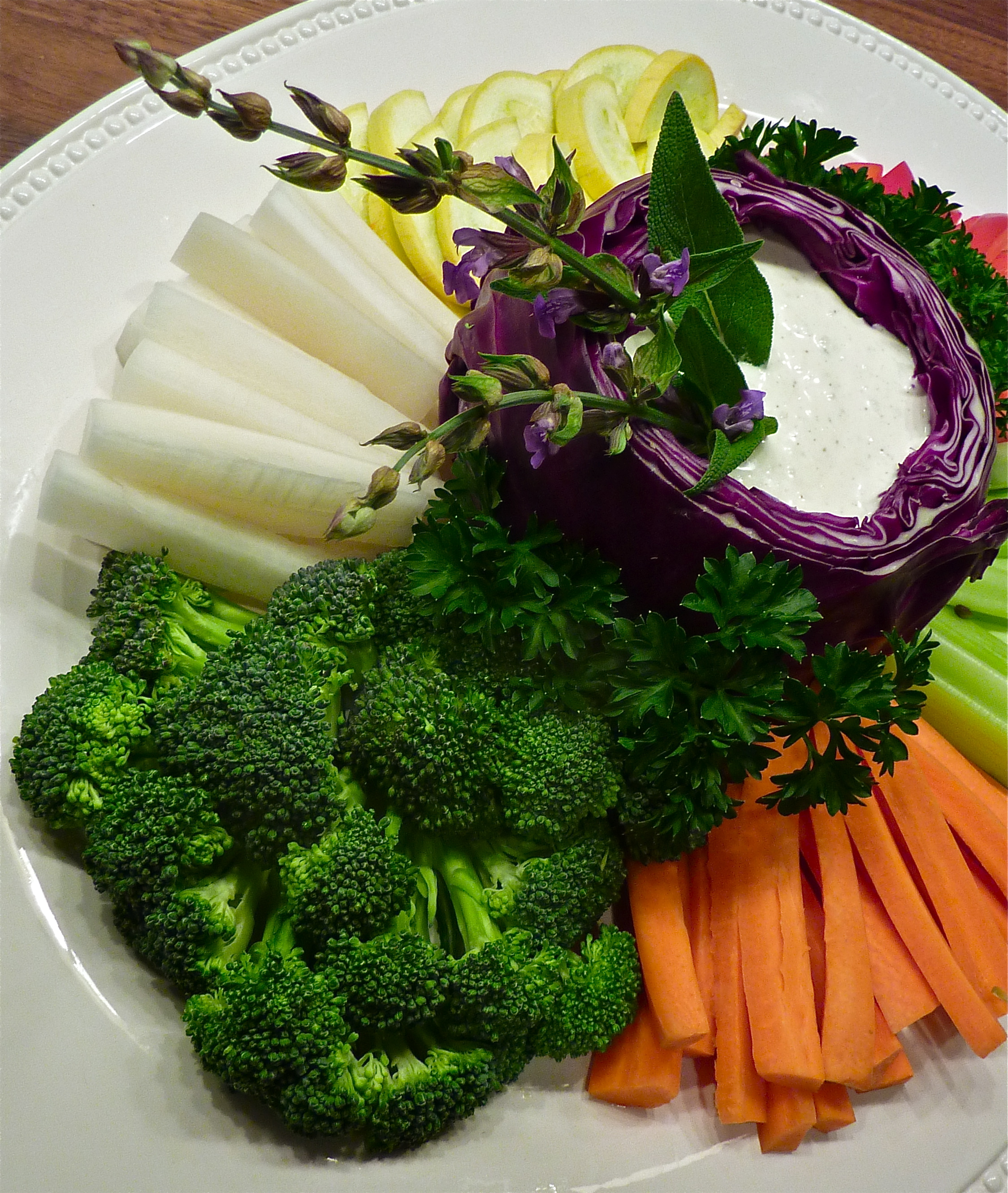 Almost any vegetable selection will work, but it won’t surprise you to know that I like to mix my colors.   So, I try to get green, yellow, red, white, etc.    The tray shown includes broccoli, daikon (Japanese radish), yellow squash, carrots, celery and sweet red pepper.  I always use a red cabbage for the dressing bowl as it give a great dash of intense color.