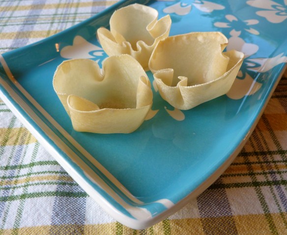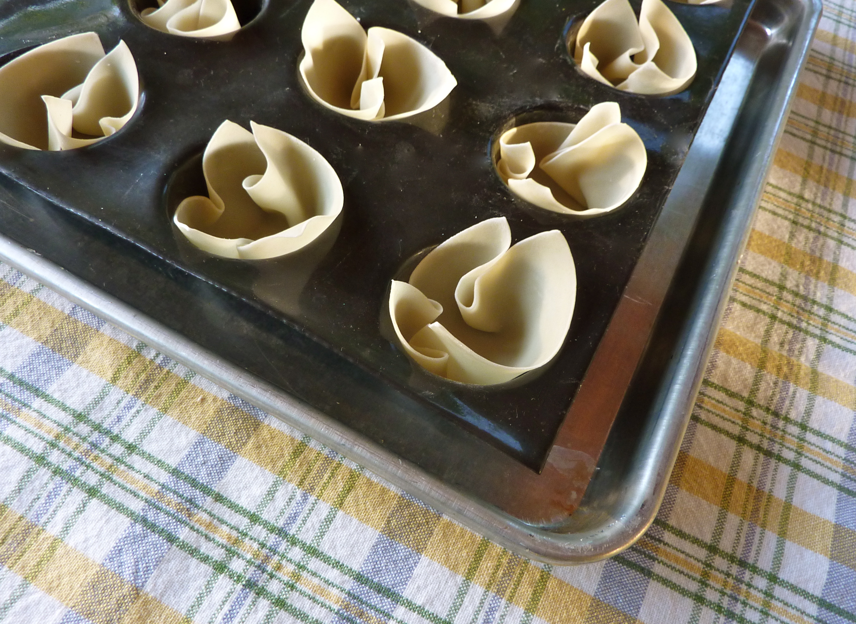 4. Preheat the oven at 370 degrees.  Use the square won tons right out of the package (3 1/4 inch squares) or use a round cutter to trim the squares so they fit below the top of the muffin cups.  The advantage of squares is that they look pretty, but you’ll need to keep a close eye on the baking time to avoid burning the corners.   The rounds bake more easily and form nice neat little cups but don’t have the elegant appearance of the squares.