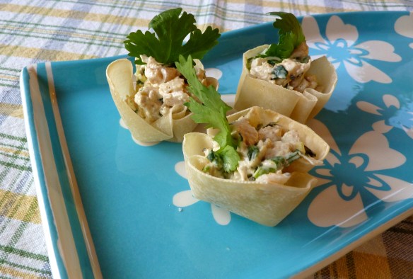 NOTE:  This recipe can be made a day ahead.  Store the finished chicken salad in the refrigerator; keep baked won tons in an air-right container at room temperature; and have a bunch of washed parsley or cilantro for garnishes.