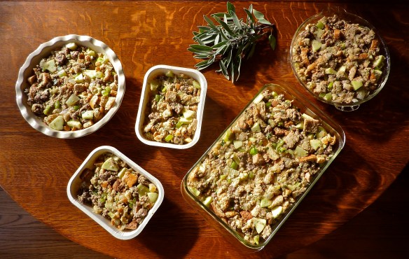 Working through my list in Do-Ahead Thanksgiving Dinner (Part 1), I have made my turkey stock and gravy, asked friends to bring pies and ordered my turkey. Now is the time to make my favorite part: stuffing — sometimes called “dressing”, a term from the English, or “forcemeat”, if you are just using just meat and binder. In my view, none of these terms make sense as I NEVER stuff a turkey, don’t “dress” the turkey, and don’t force meat into the turkey. Yet, for lack of a better term, I’ll call it stuffing.