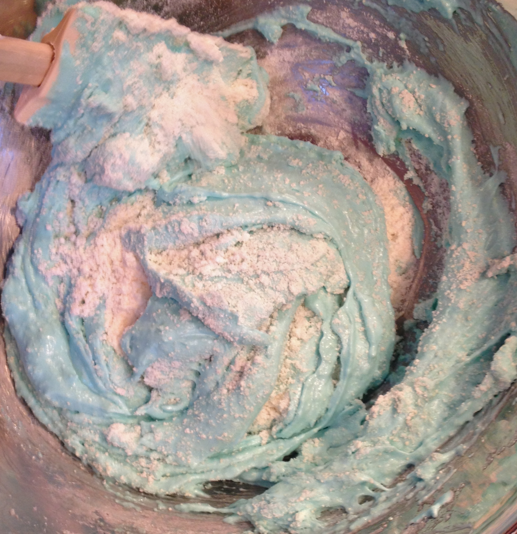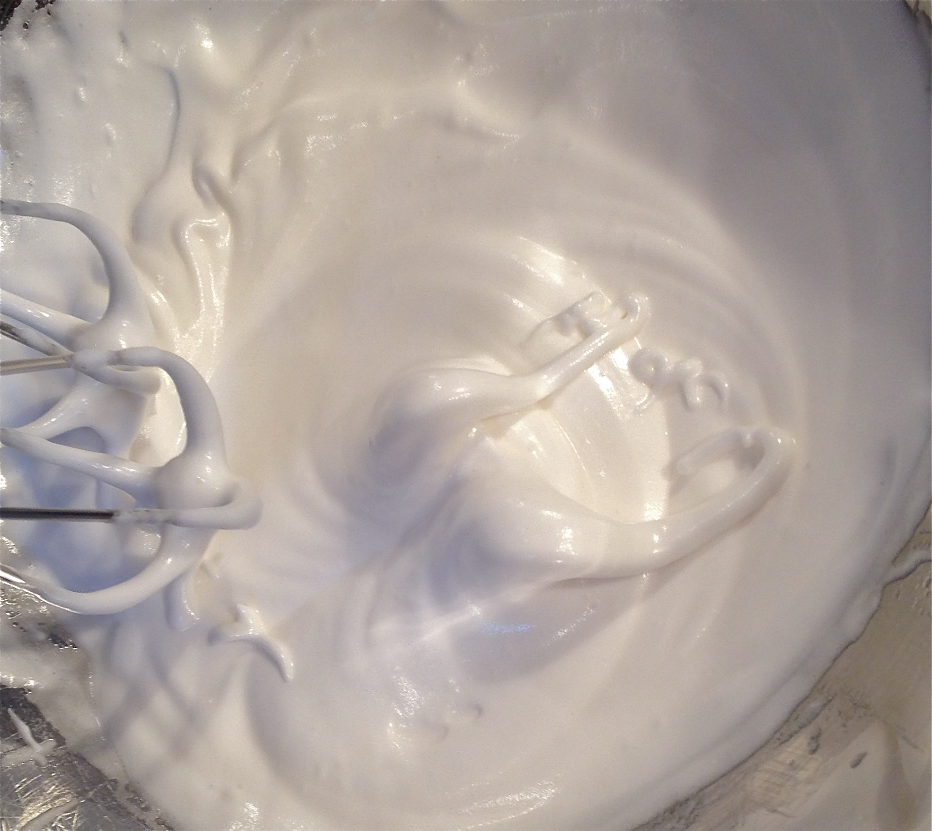 With a rubber spatula, fold one third of the almond/sugar mixture into the whipped egg whites. Once mixed, and the second third. When that is mixed, add the final third. The mixture should be glossy.
