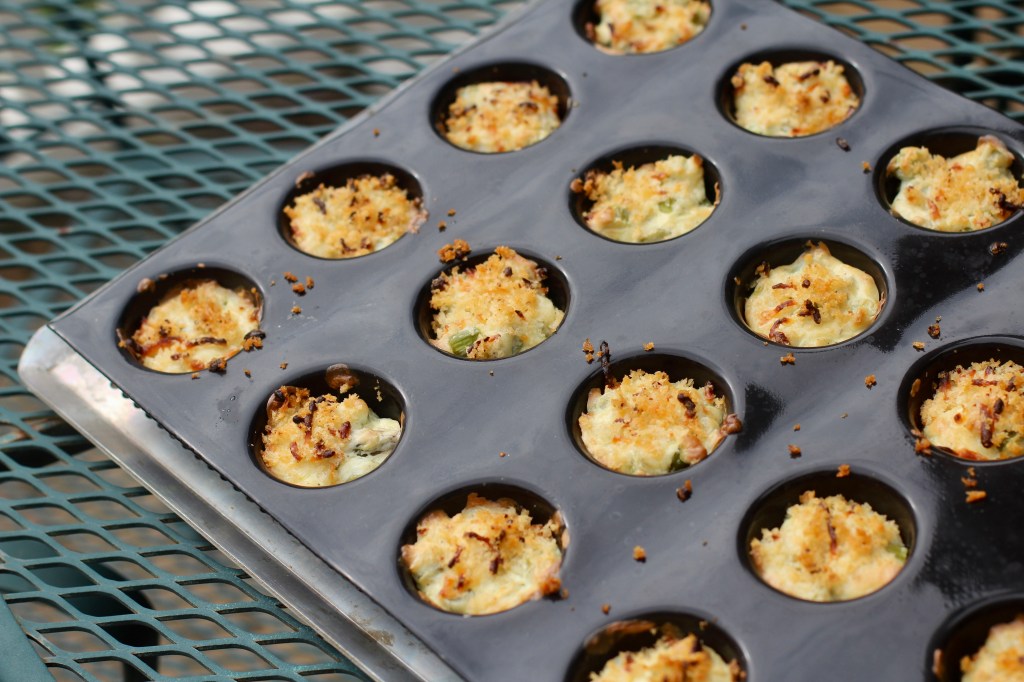 ASSEMBLY: Spoon about 4 teaspoons (one rounded tablespoon) panko/parmesan mixture into the bottom of each muffin cup. Press lightly to form the bottom crust (you do not need to press up the sides of the cup). Spoon about 4 teaspoons (one rounded tablespoon) cream cheese/asparagus mixture into each cup on top of the panko/parmesan mixture. If using 2-ounce cups, this should fill the cups about 3/4 full. Sprinkle about 1 teaspoon panko mixture in each cup as a topping.